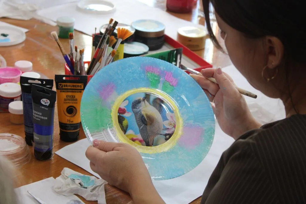 Участники работали с тарелками, осваивая технику нанесения рисунка на обратную сторону стекла. Каждый смог проявить фантазию, подобрать свой дизайн и создать уникальное декоративное изделие своими руками.